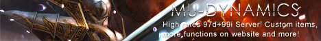 Mu-Dynamics - Version: 97D+99i, Drop: 90%, (MU)Points Shop, GodLike items for GrandResets, Custom items, Pets, New Lorencia map, Vote reward system and more! Come and join to us now!